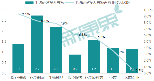 研发投入程度(即研发投入总额占营业收入的比重)是评判一个企业质量的重要指标之一,在企业上市标准中也是举足轻重的指标。以研发投入总额占营业收入的比重为标准对医药行业七个子行业进行比较,可见,医疗器械研发投入总额占营业收入的比重最高,主要原因是近些年国内医疗器械国产替代不断进行,多个子领域研发药企的数量变多,如POCT。但由于医疗器械企业规模普遍较小,因此平均研发投入总额较小。其次,化学制剂和生物制品的研发投入比重也较高,近两年在鼓励创新药的趋势下,预计这两个行业的研发投入比重还会有较大提升。最后,依旧是由于业务属性的原因,医药商业的研发投入程度最低。