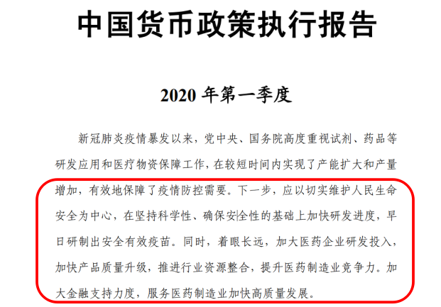 医药网5月20日讯 日前,中国央行发布2020年第一季度中国货币政策执行报告,其中强调了鼓励医药企业研发。报告指出,“下一步,应以切实维护人民生命安全为中心,在坚持科学性、确保安全性的基础上加快研发进度,早日研制出安全有效疫苗。同时,着眼长远,加大医药企业研发投入,加快产品质量升级,推进行业资源整合,提升医药制造业竞争力。加大金融支持力度,服务医药制造业加快高质量发展”。