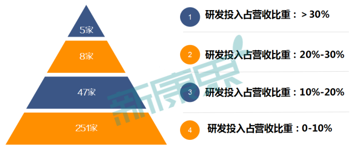 从研发投入占营业收入的比重来看,金字塔分层现象更为明显。研发投入占营收的比重达到30%以上的企业只有5家;研发投入占营收的比重在20%至30%之间的仅8家;研发投入占营收的比重在10%至20%之间的有47家;而研发投入占营收的比重不足10%的企业有251家,占据行业整体的80%!