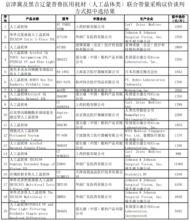 医药网5月21日讯 5月18日,京津冀医用耗材联合采购平台发布《京津冀及黑吉辽蒙晋鲁医用耗材(人工晶体类)联合带量采购议价谈判方式拟中选结果公示》,公布3+6耗材谈判中标械企及价格。