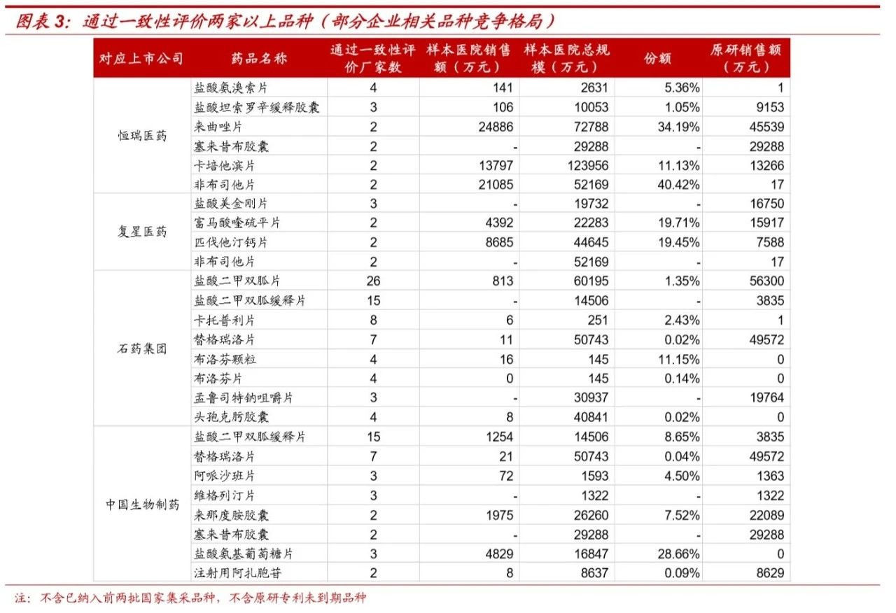 而从涉及企业来看,恒瑞医药、复星医药、石药集团及中国生物制药都可能会是涉及到第三轮国家集采品种较多的上市企业。中泰证券研发分析显示,恒瑞医药可能涉及三轮国家集采的品种有6个,其中卡培他滨片、非布司他片、来曲唑片的市场总规模分别超过12亿元、7亿元及5亿元,但恒瑞医药在市场中占据的份额并未过半,原研药还是把持了相当大的市场份额,带量采购或许能给这些品种翻盘提供机会。