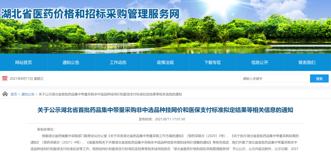 医药网8月12日讯 8月11日,湖北省医药价格和招标采购管理服务网发布《关于公示湖北省首批药品集中带量采购非中选品种挂网价和医保支付标准拟定结果等相关信息的通知》。在披露多达300个药品最新挂网价的同时,湖北也确定了除30个非医保目录内药品外的270个药品的医保支付标准,以及361个未按规定申报挂网价调整而被暂停挂网的药品。