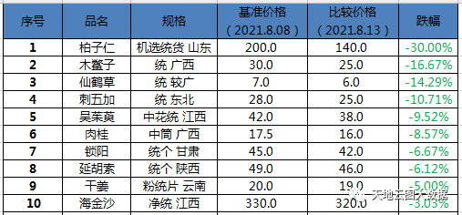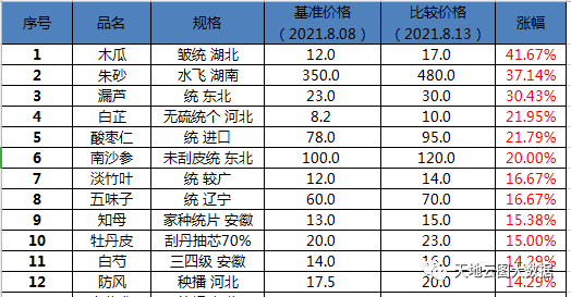 医药网8月16日讯 2021年8月8日-8月14日,天地云图中药产业大数据中心监控的1587个品种(包括相同品种不同品规不同产地,下同)中,上涨品种数66个,较上周增加1个,下跌品种数21个,较上周减少18个,其余商品本周价格波动不大。