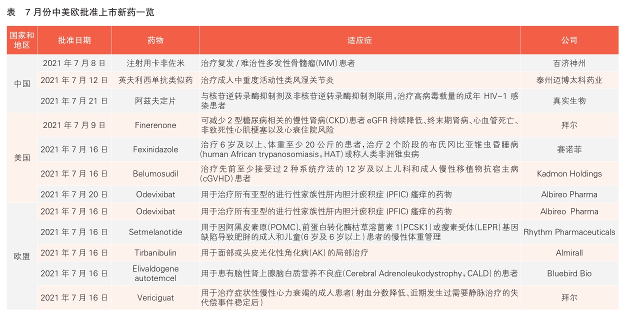 7月份,欧盟批准了5款新药上市,其中Odevixibat和一次性基因疗法Elivaldogene autotemcel是在全球首次获批上市,其余均在美国首先获批。