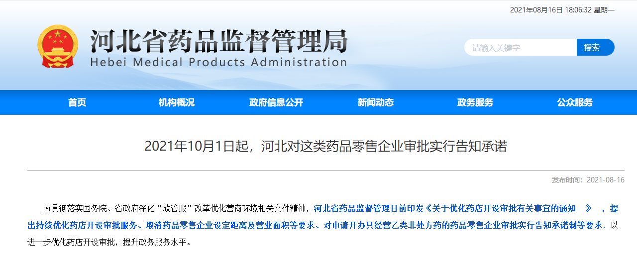 8月16日,河北省药监局再次发文强调,将取消对药品零售企业设定距离及营业面积的限制,自2021年10月1日起生效。