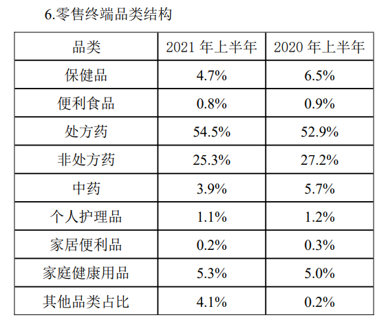 国大药房经营商品品规近16万种,零售终端品类中,处方药占比最大,达54.5%,其次是非处方药,占25.3%,保健品和中药的占比较上一年同期有所下降。