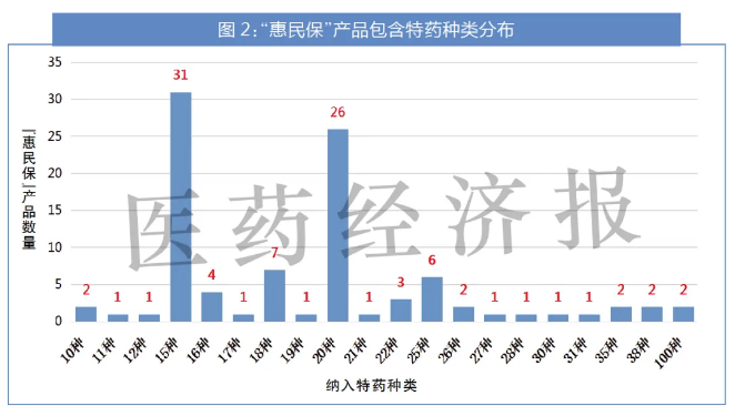 “惠民保”涵盖特药药品数量大多在15~25种,平均值和中位值均为20种左右(详见图2)。