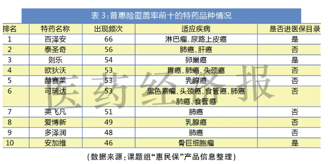 据不完全统计,普惠险覆盖率前十的特药均为抗肿瘤药。其中,百泽安(替雷利珠)、泰圣奇(阿替利珠)和则乐(尼拉帕利)是“惠民保”产品最青睐的三种药品(详见表3)。