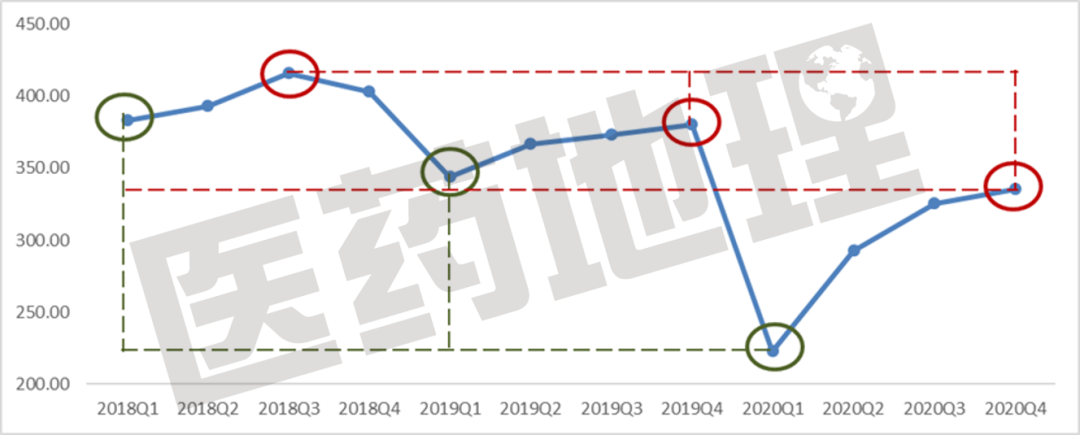 图1 中药市场近年整体趋势(2018Q1-2020Q4,亿元)