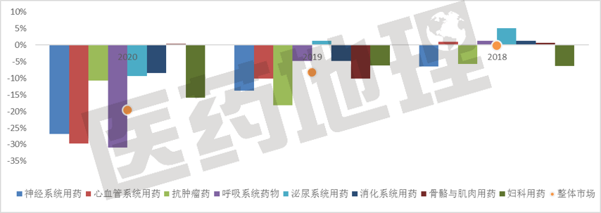 2020年,统计当前的TOP8治疗领域增长情况后发现(以中药主治疾病的治疗大类计),受整体市场影响,仅有骨骼肌肉用药出现了极微弱的增长,而其他领域都是负增长,但程度有所不同,有4个领域的降幅在市场均值以上(抗肿瘤、泌尿、消化、妇科),仅有2个领域在近三年的增速均高于市场均值(泌尿、消化)。而神经系统用药作为市场份额第一的治疗类别,近三年的增速均低于市场均值。