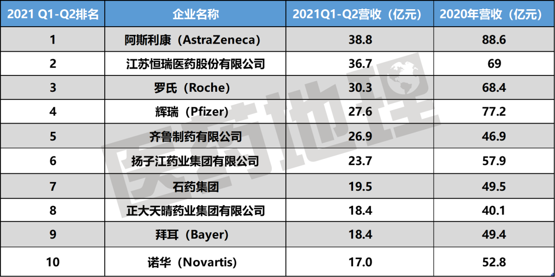 2021前半年,销售额突破2.5亿大关的产品共有83种,销售额突破5亿元的产品共有24种,销售额突破10亿元仅有6种。我们整理了2021前半年销售额排名TOP20的药品,并将其与2020年的销售额排名进行比较。