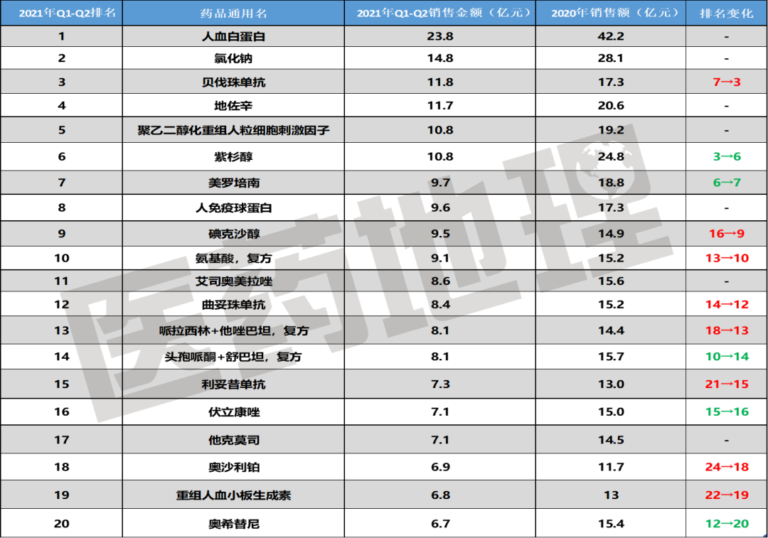 可以发现,人血白蛋白依然稳居“宝座”,地位无可撼动,以23.8亿元的销售额领跑全榜,比第二名氯化钠高出了9亿元!第三名是贝伐珠单抗,今年表现十分亮眼,以11.8亿元的销售额力压地佐辛,以微弱优势成为季军。而传统的“三哥”紫杉醇今年上半年发挥并不理想,仅取得了10.8亿元的销售额,下滑至第六名。此外,碘克沙醇、复方氨基酸、曲妥珠单抗、哌拉西林+他唑巴坦复方制剂、利妥昔单抗、奥沙利铂、重组人血小板生长素都有了不同程度的进步,利妥昔单抗、重组人血小板生长素、奥沙利铂更是首次进入榜单。而2020年最大的黑马奥希替尼,似乎后劲乏力,仅以6.7亿元销售额勉强进入了排行榜,期待它再创奇迹。