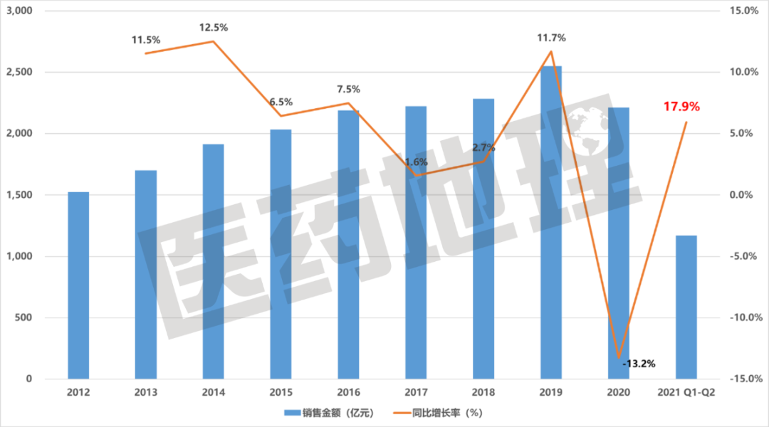 医药网9月3日讯 新冠疫情的余波仍未消散,国内零星的疫情反弹。在保障疫情防控工作的基础上,2021年前半年,我国重点城市的样本医院市场销售额大幅提升,同比增幅约为17.9%,考虑到2020年前半年疫情所造成的医药行业营收下滑,可以说2021年前半年,我国医药全领域市场已基本恢复至疫情前水平。