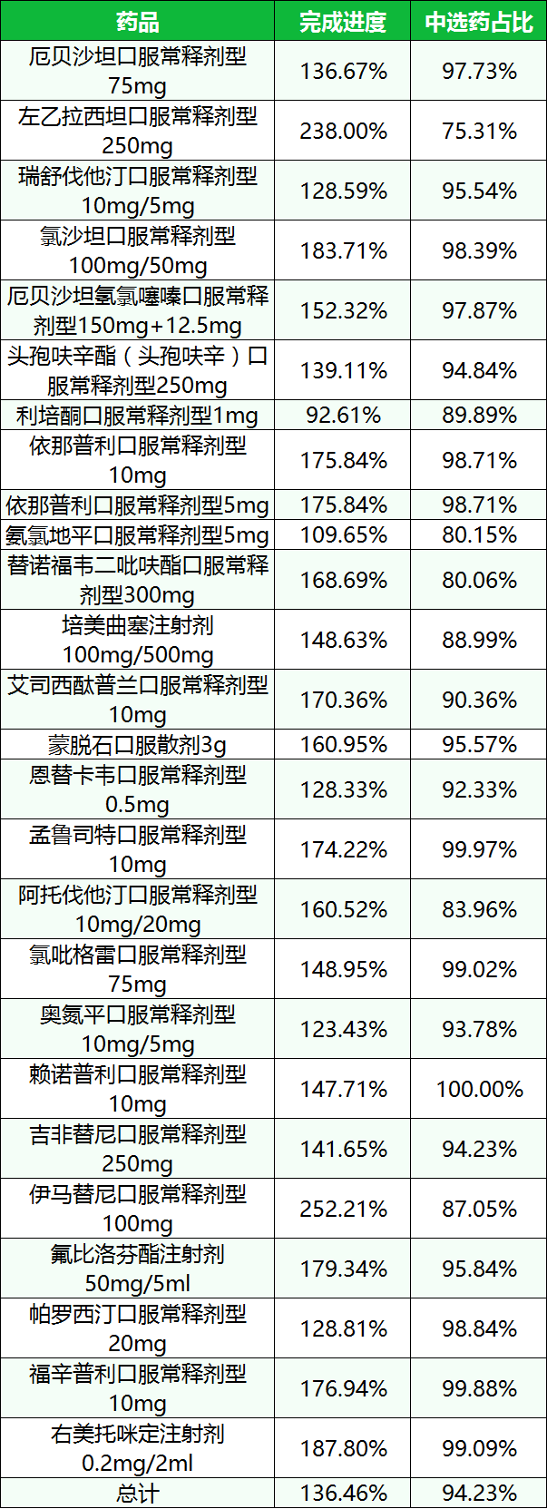 中选药完成进度和占比。中选药品的全省采购总数量占约定采购总量的比例为136.46%,占同品规所有药品采购总数量的比例为94.23%。