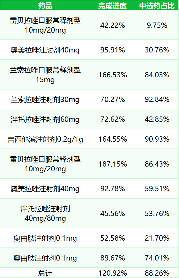 中选药完成进度和占比。中选药品的全省采购总数量占约定采购总量的比例为120.92%,占同品规所有药品采购总数量的比例为88.26%。
