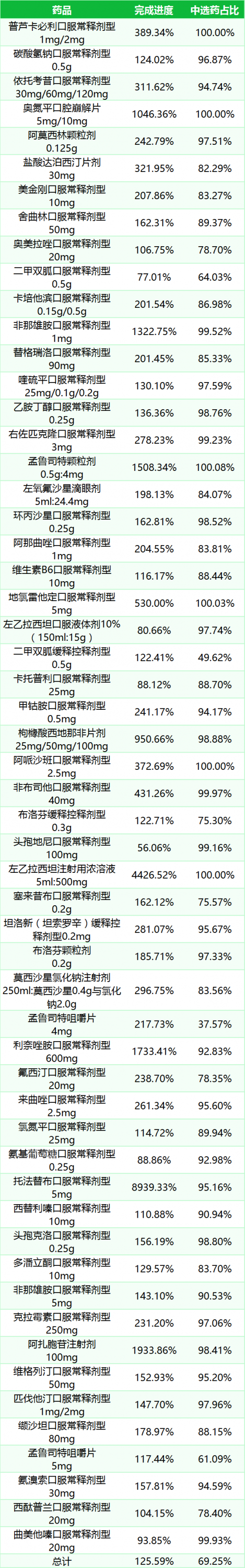 中选药完成进度和占比。中选药品的全省采购总数量占约定采购总量的比例为125.59%,占同品规所有药品采购总数量的比例为69.25%。
