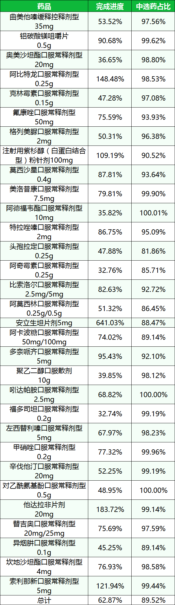 中选药完成进度和占比。中选药品的全省采购总数量占约定采购总量的比例为62.87%,占同品规所有药品采购总数量的比例为89.52%。