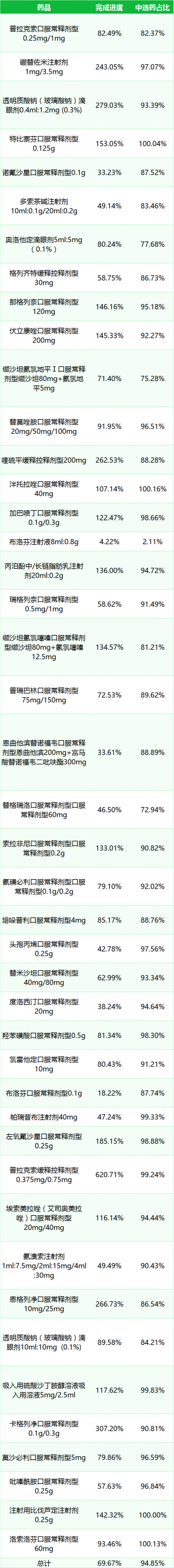 中选药完成进度和占比。中选药品的全省采购总数量占约定采购总量的比例为69.67%,占同品规所有药品采购总数量的比例为94.85%。