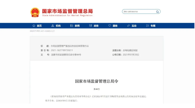 医药网9月3日讯 国家市场监督管理总局此前公布的《市场监督管理严重违法失信名单管理办法》(以下简称《办法》)、《市场监督管理行政处罚信息公示规定》《市场监督管理信用修复管理办法》等三份部门规章和规范性文件,自2021年9月1日起正式施行。