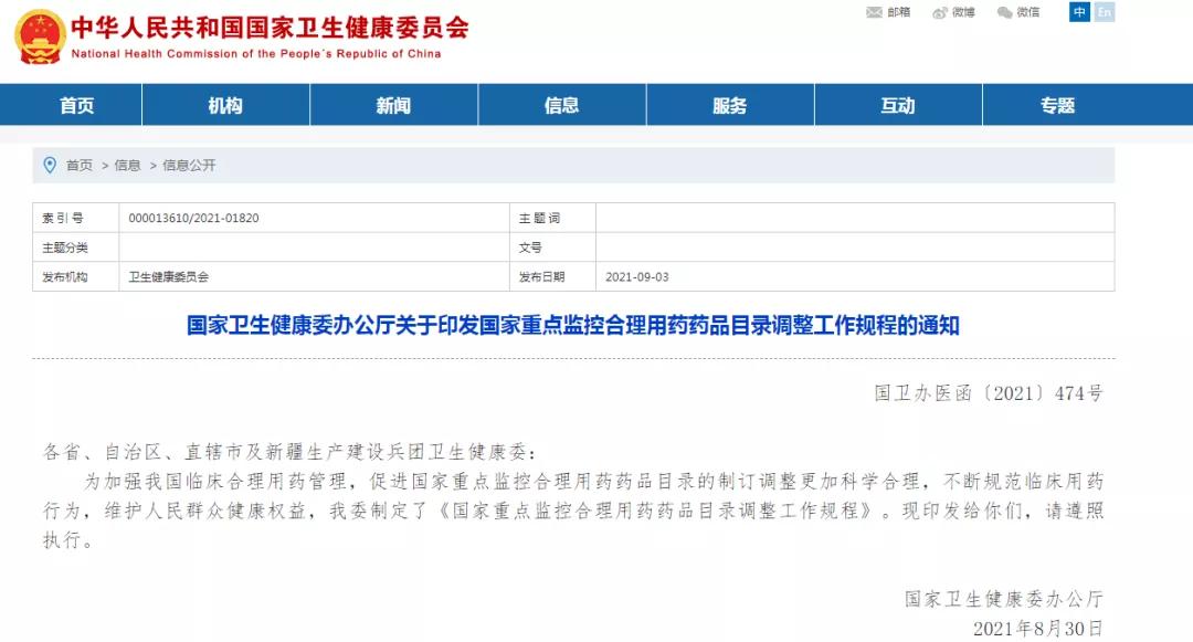 2019年7月1日,国家卫健委和国家中医药管理局发布《第一批国家重点监控合理用药药品目录(化药及生物制品)》,将20种药品的使用纳入重点监控范围。各省在此基础上,对其略有调整。