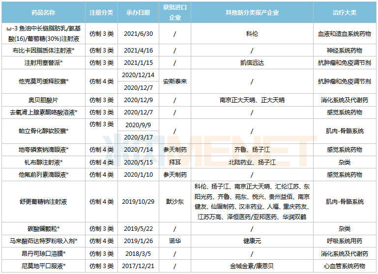 12个品种由恒瑞医药首家/独家以新分类报产,包括布比卡因脂质体注射液、他克莫司缓释胶囊、去氧肾上腺素酮咯酸溶液、地夸磷索钠滴眼液、他氟前列素滴眼液、马来酸茚达特罗粉吸入剂、钆布醇注射液等。