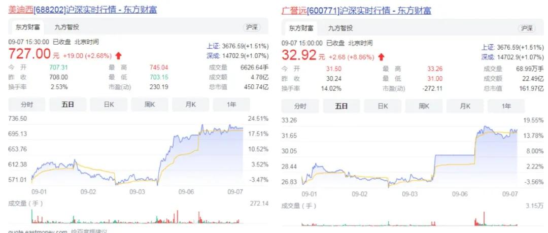 近两日,医药股的回弹引起广泛关注。9月6日,医药板块普遍反弹,涨幅达4.25%,位居申万一级行业排名第1,其中,CRO、中药概念领涨。与此同时,医药板块也掀起涨停潮,美迪西、新华医疗、通策医疗、昭衍新药、凯莱英、天坛生物、精华制药、健民集团、广誉远等纷纷涨停。9月7日,这些医药股继续上扬。