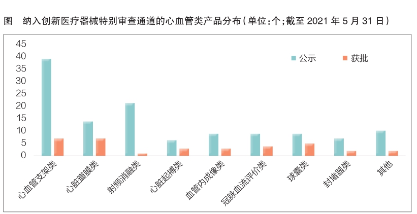 目前,除心血管支架和心脏瓣膜类产品外,多款射频消融类、心脏起搏类、血管内成像类、冠脉血流评价类、球囊类、封堵器类产品,也被纳入创新医疗器械特别审查通道并获批上市(见图)。