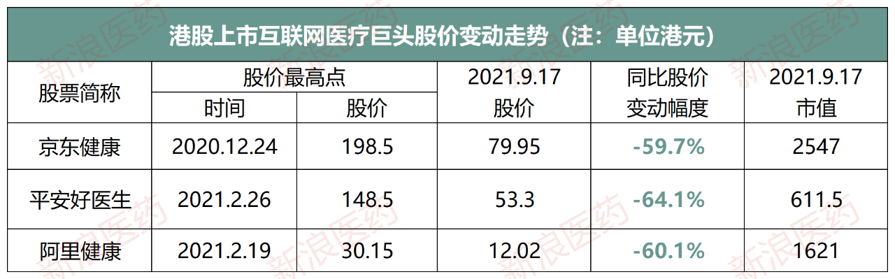 截至2021年9月17日,京东健康、阿里健康、平安好医生三巨头距离股价最高点平均跌幅已超60%,而第N次启动上市计划的微医还迟迟没有跑入资本市场,零氪科技更是在赴美上市前夕紧急喊停,叮当快药上市行动未见进展,医联甚至还在今年6月联系新浪医药直接否认盛传的“IPO计划”。