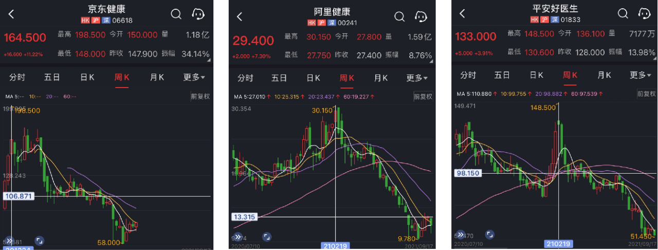 在以上诸多因素的影响下,京东健康、阿里健康、平安好医生自然也遭到一波估值杀。