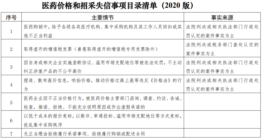 2020年8月,国家医保局发布《国家医疗保障局关于建立医药价格和招采信用评价制度的指导意见》,业内视该文件为医保局对失信企业的黑名单制度。同年11月20日,国家医保局官网正式挂网公布《医药价格和招采信用评价的操作规范(2020版)》与《医药价格和招采信用评级的裁量基准(2020版)》。