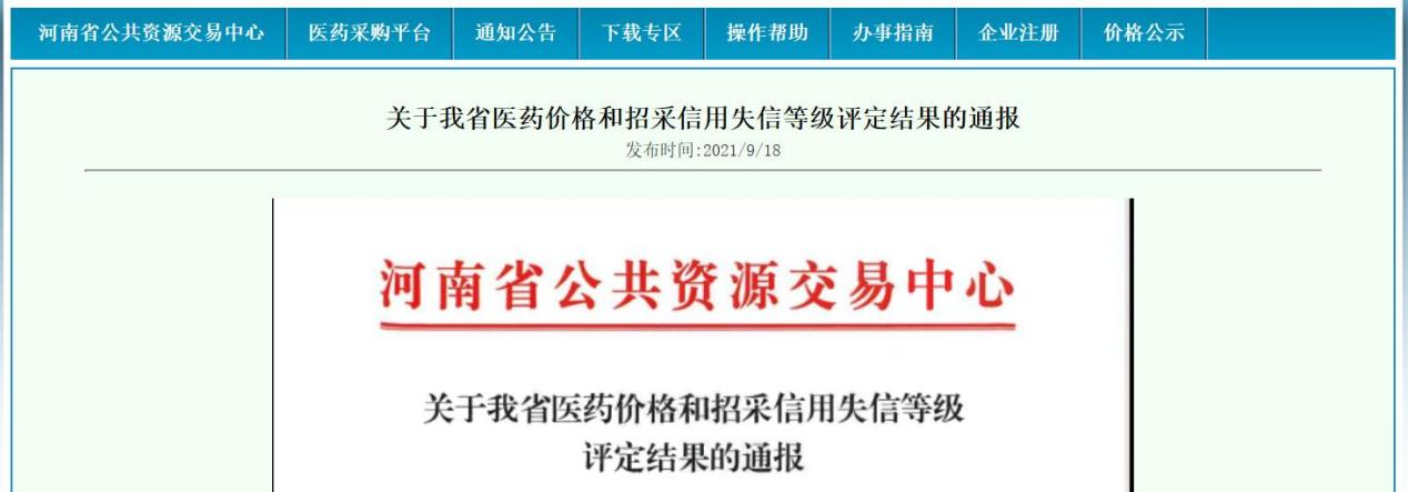 9月18日,河南省公共资源交易中心官网发布关于该省医药价格和招采信用失信等级评定结果的通报。公告显示,宜昌人福药业和北京百奥药业两家药企分别因为商业贿赂、集采断供在河南省医药价格和招采信用失信等级评定为“严重”。