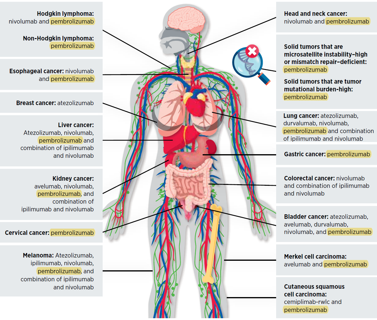 截至2020年7月31日,FDA批准的免疫检查点抑制剂,高亮为K药