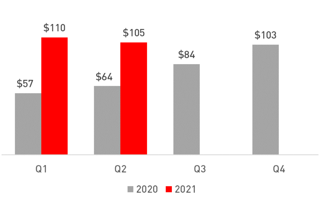 2020~2021年中国信迪利单抗季度销售额(单位:百万美元)