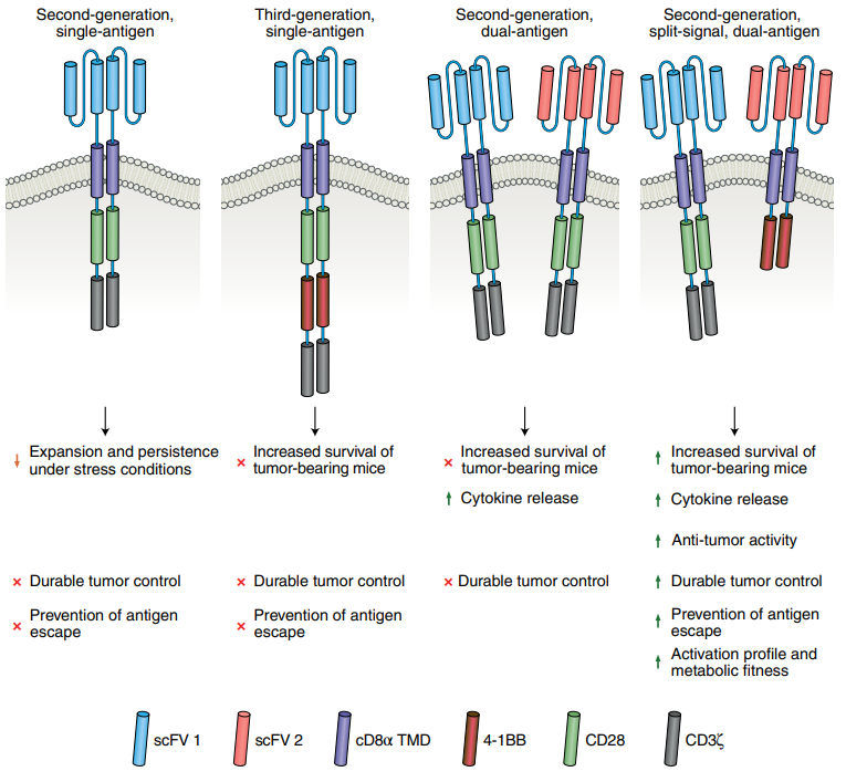 ▲示意图展示了多代嵌合抗原受体(CAR)的概念,最新研究展示的是双靶标,双共刺激分子信号CAR(图片来源:参考资料[1])