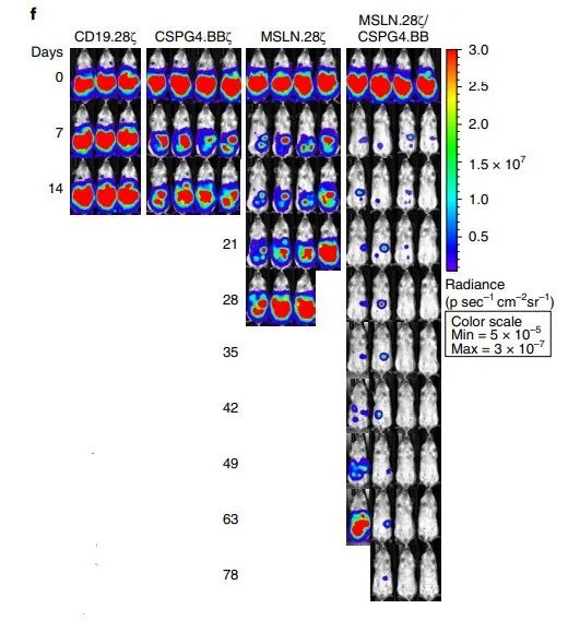 而在小鼠实验中,研究者向小鼠中引入了神经母细胞瘤细胞,仅仅使用单一抗原靶标的小鼠会在不久之后遭受肿瘤复发的情况。而利用以往几代CAR-T的方法都无法阻止肿瘤复发过程,唯独双靶标-双信号CAR-T细胞能够实现这一目标,控制肿瘤生长。