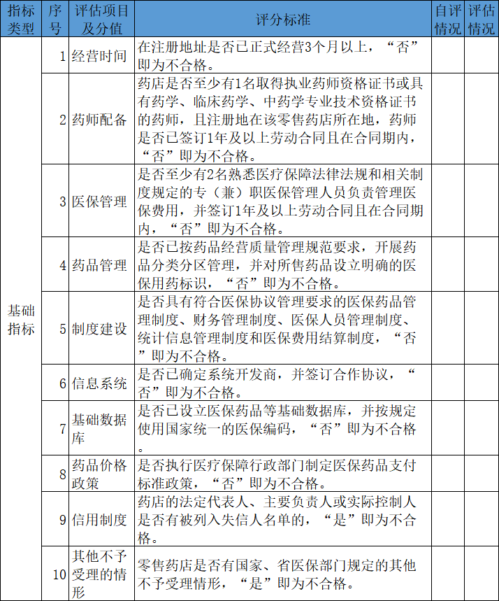 根据细则信息,定点药店共有26个评估项目,其中基础指标10项,评估指标16项。按照要求,但凡基础指标任意一项不合格,即视为评估结果不合格。基础指标具体信息如下图所示: