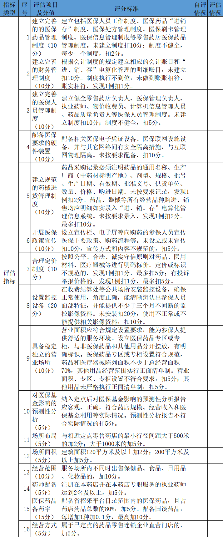 值得关注的是,细则制定了《医疗保障定点零售药店评估表》(以下简称《评估表》),对零售药店进行打分,市级经办机构可在《评估表》基础上针对本地情况进行调整。然后,评估小组结合得分情况,提出拟新增医保定点的零售药店名单。