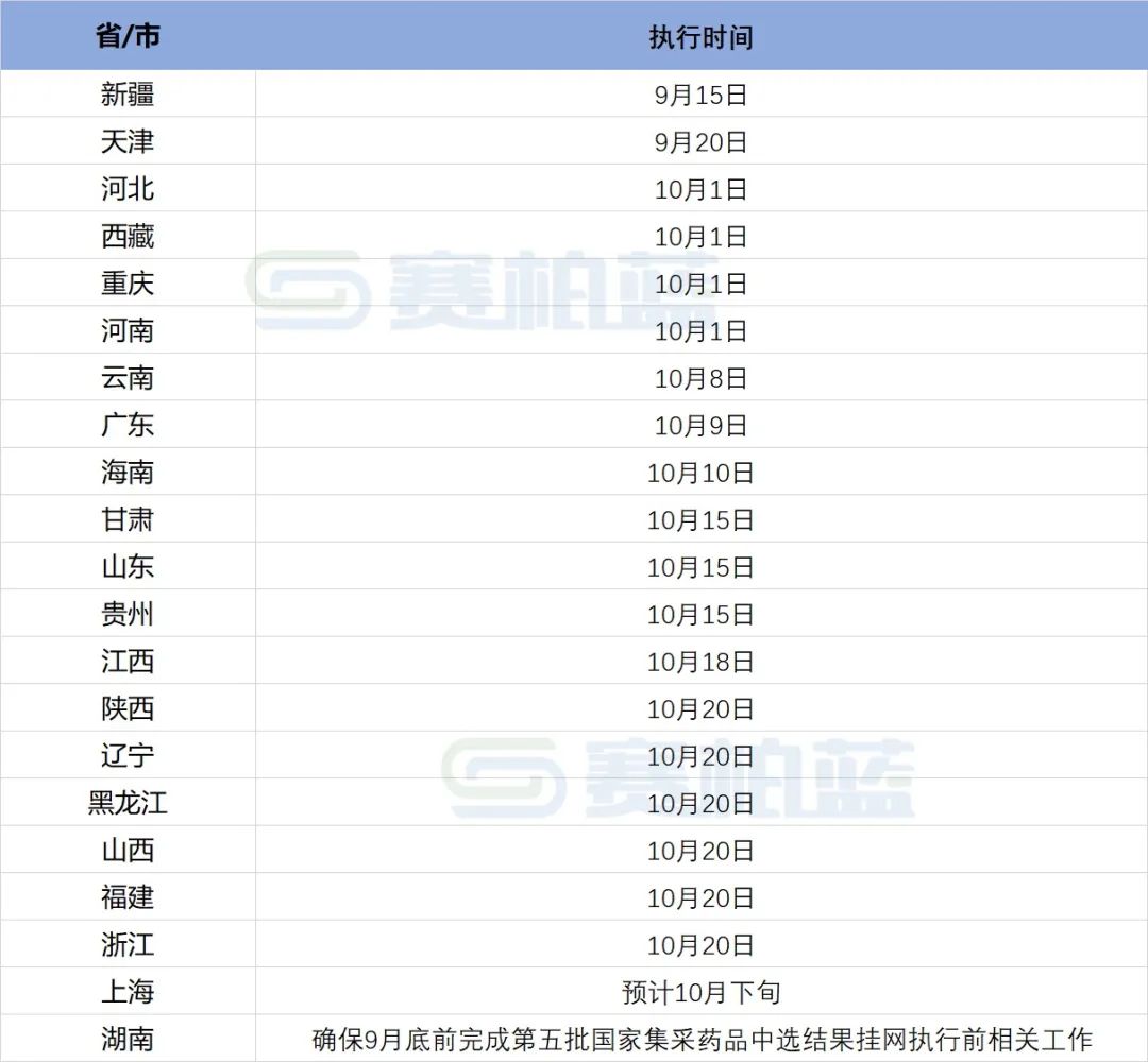 赛柏蓝梳理发现,截至目前已经有21个省/市发布了第五批国采具体的执行时间。
