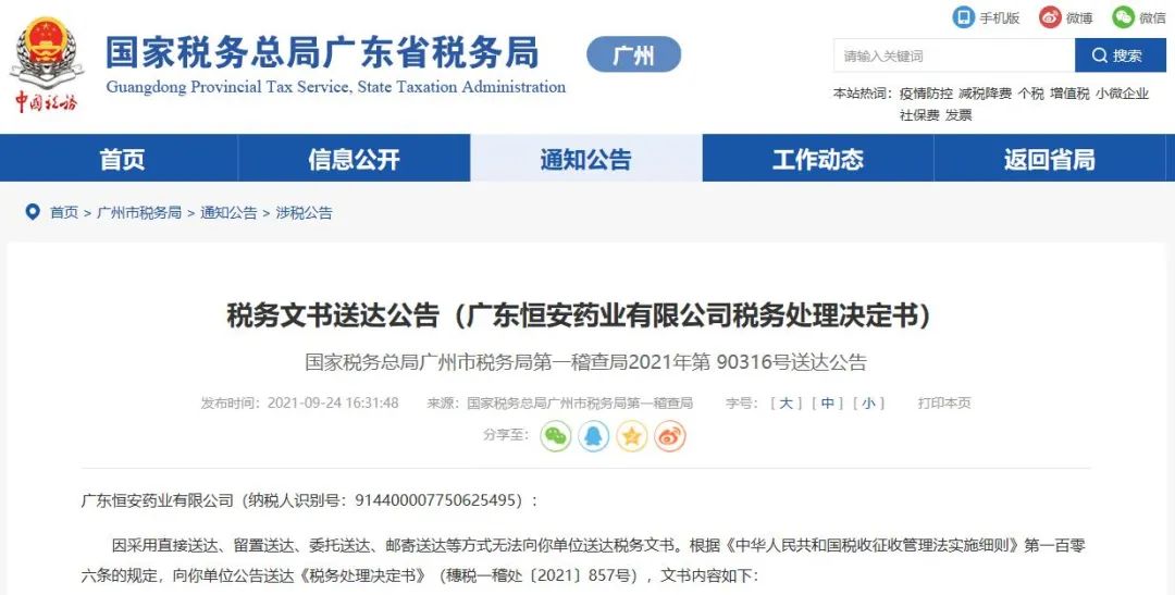 税务文书送达公告(广东恒安药业有限公司税务处理决定书)