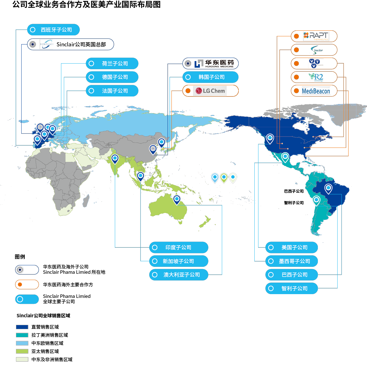 和国内其他医美企业不同的是,华东医药在医美领域的布局全部为境外交易,产品定位高端,交易范围不仅仅是个别产品中国区域的商业化权益,其战略目标是要在全球范围内进行医美全产业链布局。公司医美产业以英国全资子公司Sinclair为全球化运营平台,现拥有包括英国Sinclair、西班牙High Tech以及参股公司美国R2、瑞士Kylane在内的四个研发中心,并在全球拥有荷兰、法国、美国、瑞士和保加利亚五个生产基地,多款核心产品已在全球60多个国家和地区上市。