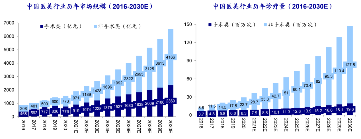 近年来,医美行业逐渐步入公众视野,成为颜值经济时代下的最大受益者之一。弗若斯特沙利文数据显示,目前全球医美市场已进入稳定发展时期,保守估计全球医美市场规模将从2018年的1357亿美元增长至2022年的1782亿美元,CAGR 7.5%。而中国医美市场由2016年的776亿元增至2020年的1549亿元,CAGR为18.9%,且其预计于2025年将达到3519亿元,2030年将达到6535亿元。中国医疗美容市场规模的增长率远高于全球市场,预计2020年至2030年中国医疗美容市场增量占全球同期市场增量的三分之一。