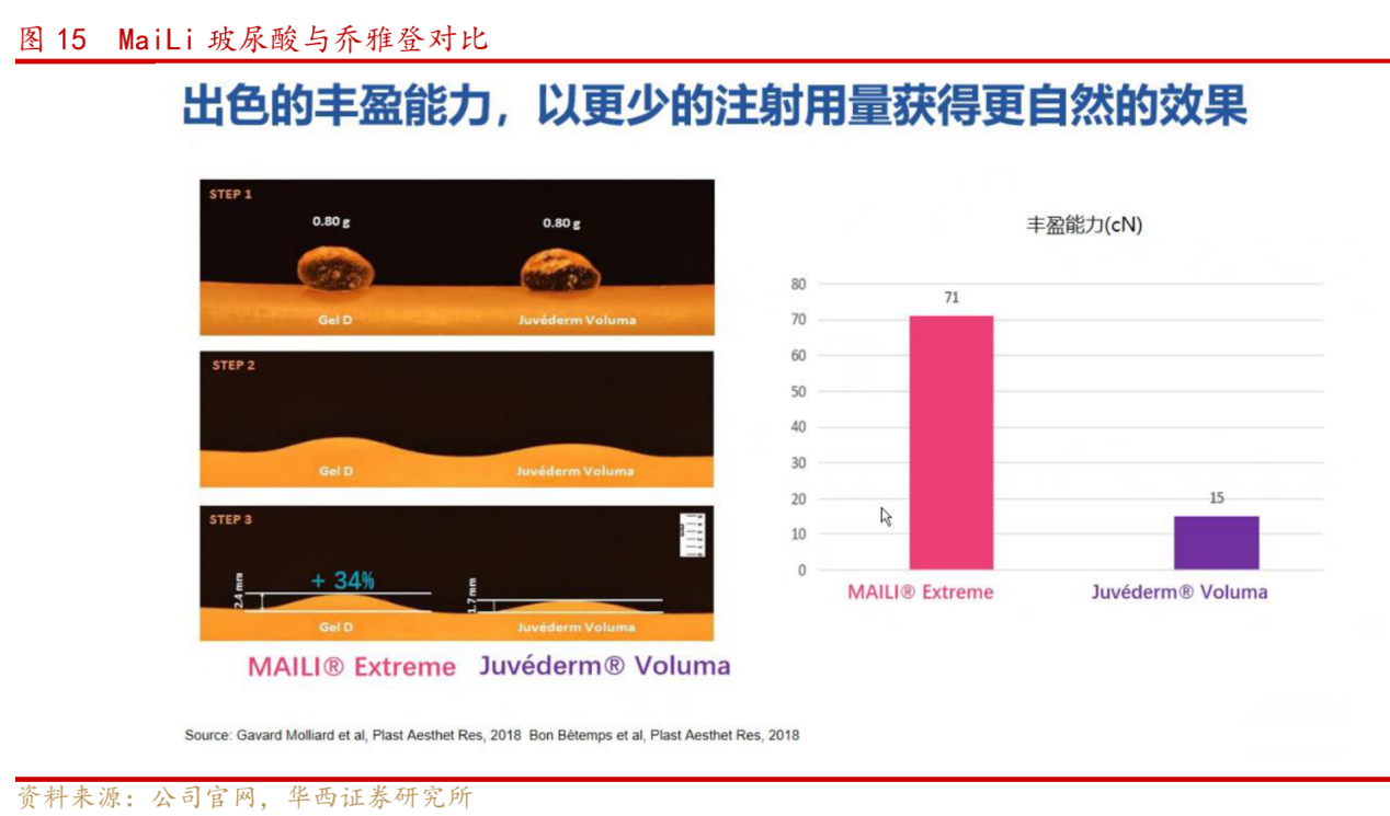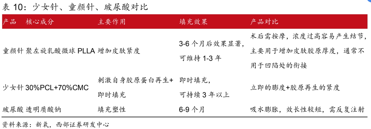 从功效上看,华东医药“少女针” 是玻尿酸和“童颜针”结合体。普通玻尿酸是修饰型填充,童颜针则无填充剂,仅有胶原蛋白刺激作用,且起效需要2个月时间。而少女针是修复型填充,可以立刻看到填充效果,胶原蛋白刺激微球又可以修复皮下胶原纤维,从而达到“填充+修复”双重功效。