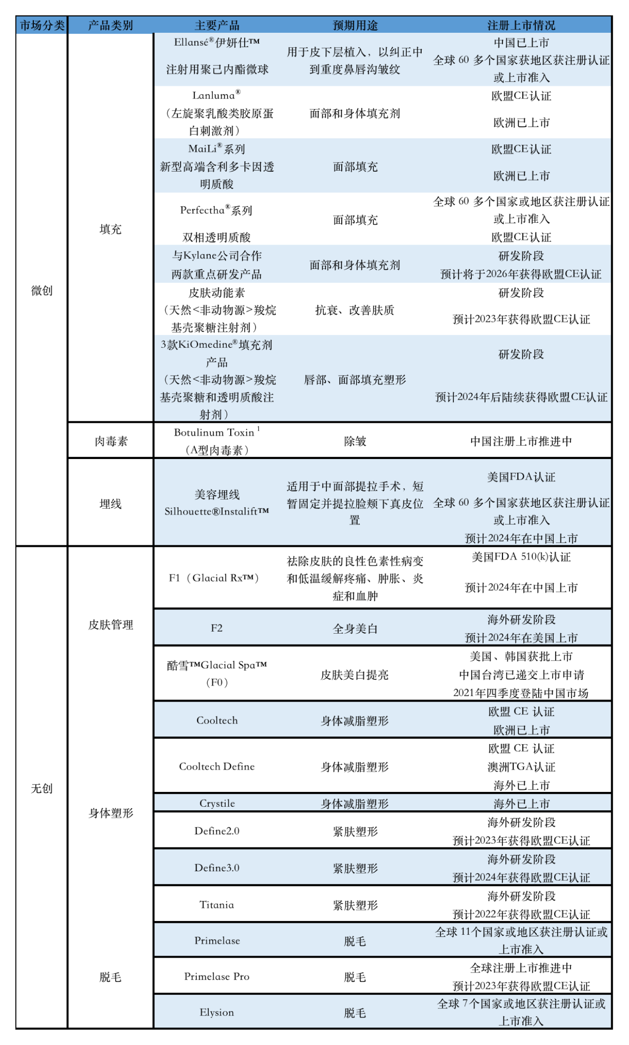 除上述创新医美产品外,另有Botulinum Toxin(A型肉毒素)以及与Kylane公司合作在研的全球创新型两款面部和身体填充剂。