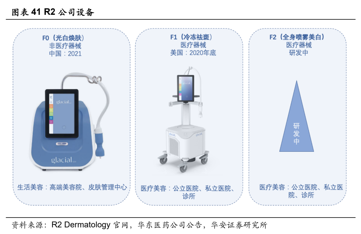 美国R2公司的冷触美容仪Glacial SpaTM(F0)正在积极筹备中国上市前的相关工作,预计于2021年四季度正式上市销售。F0冷触美容仪由现代激光医学之父,美国麻省总医院威尔曼光电医学中心主任 Rox Anderson, M.D.为核心的技术团队研发。