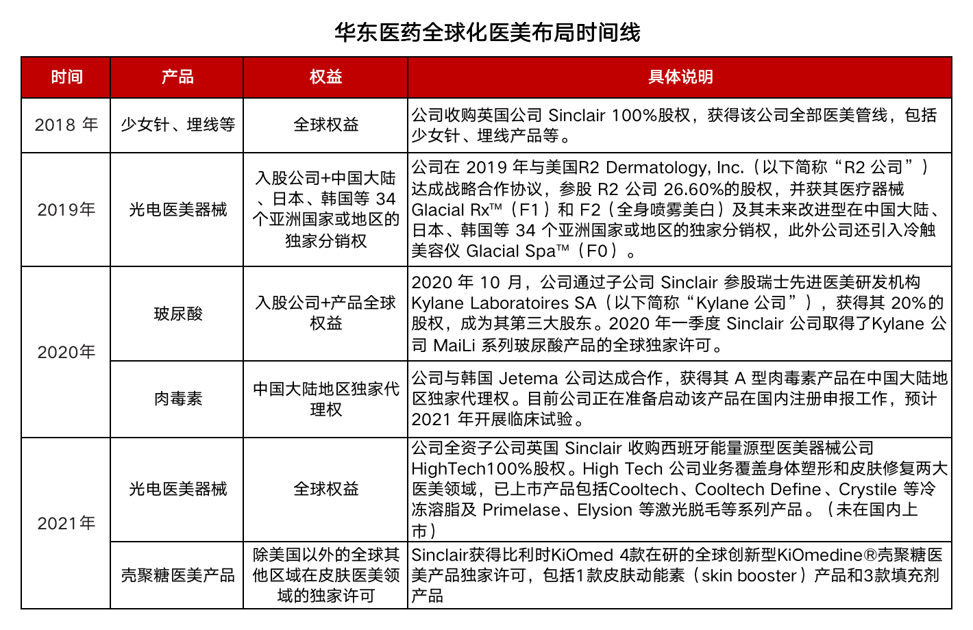 自2018年11月,华东医药全资收购英国高端医美企业Sinclair,便开启了全球化医美版图扩张。截至2021年10月,公司3年间在医美领域已经陆续完成了6笔交易。