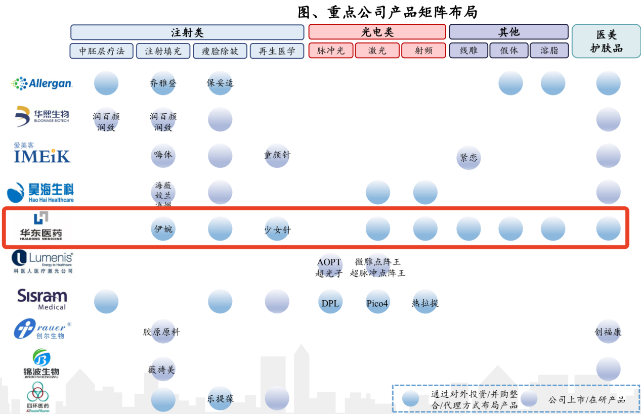 其中产品矩阵的布局能力在于公司是否有差异化的产品及全面的产品线。华东医药旗下美学产品组合不仅覆盖面部填充剂、能量源器械等非手术类主流产品,且均定位于高端市场,“少女针”等多个独家产品具备差异化市场竞争力。