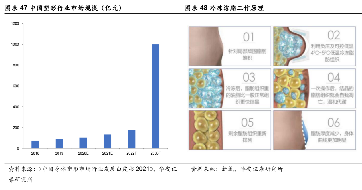 除了用于脸部轻医美产品,身体塑形市场也正成为一大热门领域。据德勤《中国身体塑形市场行业发展白皮书 2021》统计,中国塑形市场的市场规模在 2020 年约为105亿,预计 2020~2022 年复合增速达到24%,高于医美整体市场的18%。此外,中国塑形场渗透率低,2019年,成熟美国市场的渗透率为2.8 次/千人,而中国渗透率仅为0.8 次/千人,市场开发方面仍然存在较大的增长空间。