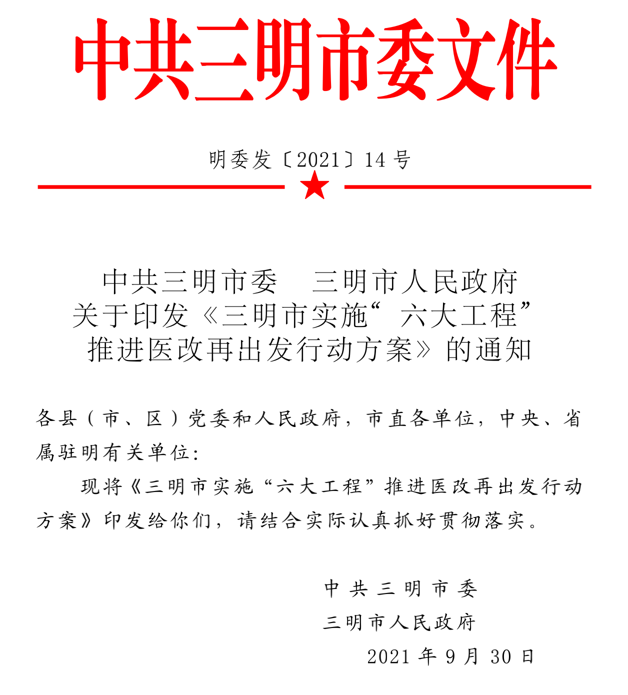2021年10月9日,三明市委、三明市人民政府公开发布《三明市实施“六大工程”推动医改再出发行动方案》(下文简称《“六大工程”行动方案》)。
