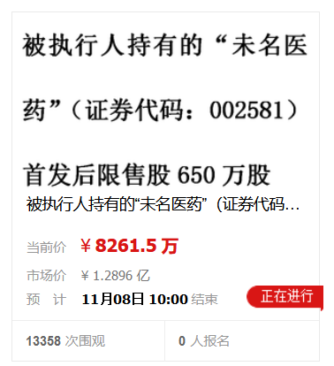 据淘宝网显示,未名医药还有一笔650万股拍卖正在进行,当前价格为8261.5万元,拍品所有人是未名医药股东绍兴金晖越商投资合伙企业。11月8日10点结束,花落谁家,拭目以待。