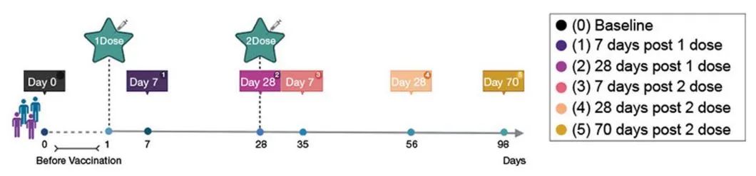 ▲研究人员从参与者接种疫苗前到接种第二剂后70天定期采集了血液样本进行评估(图片来源:参考资料[1])